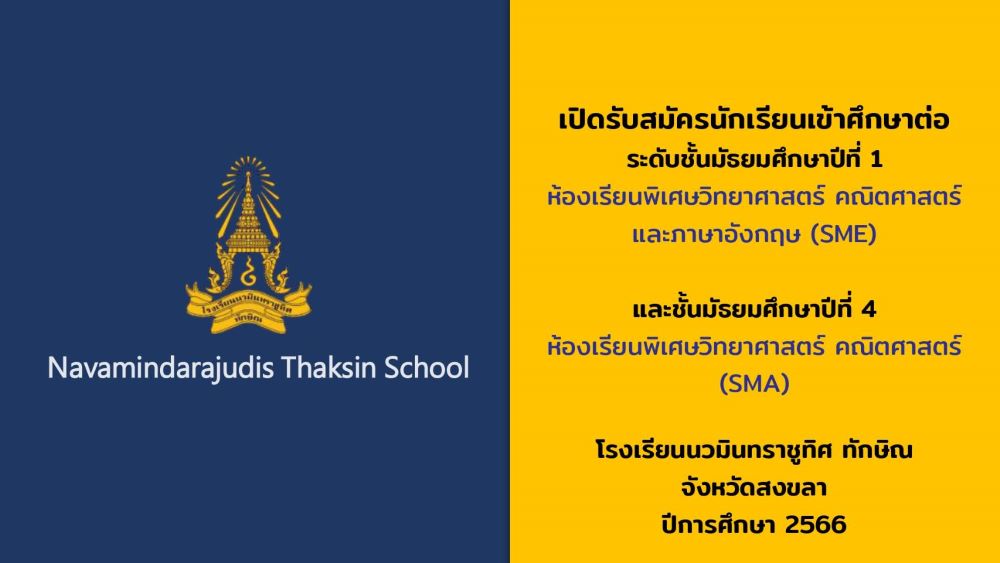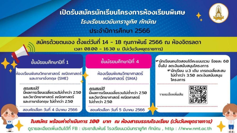 เปิดรับสมัครนักเรียนใหม่ ชั้น ม.1 ห้องเรียนพิเศษ (SME) และชั้น ม.4 ห้องเรียนพิเศษ (SMA) ปีการศึกษา 2566