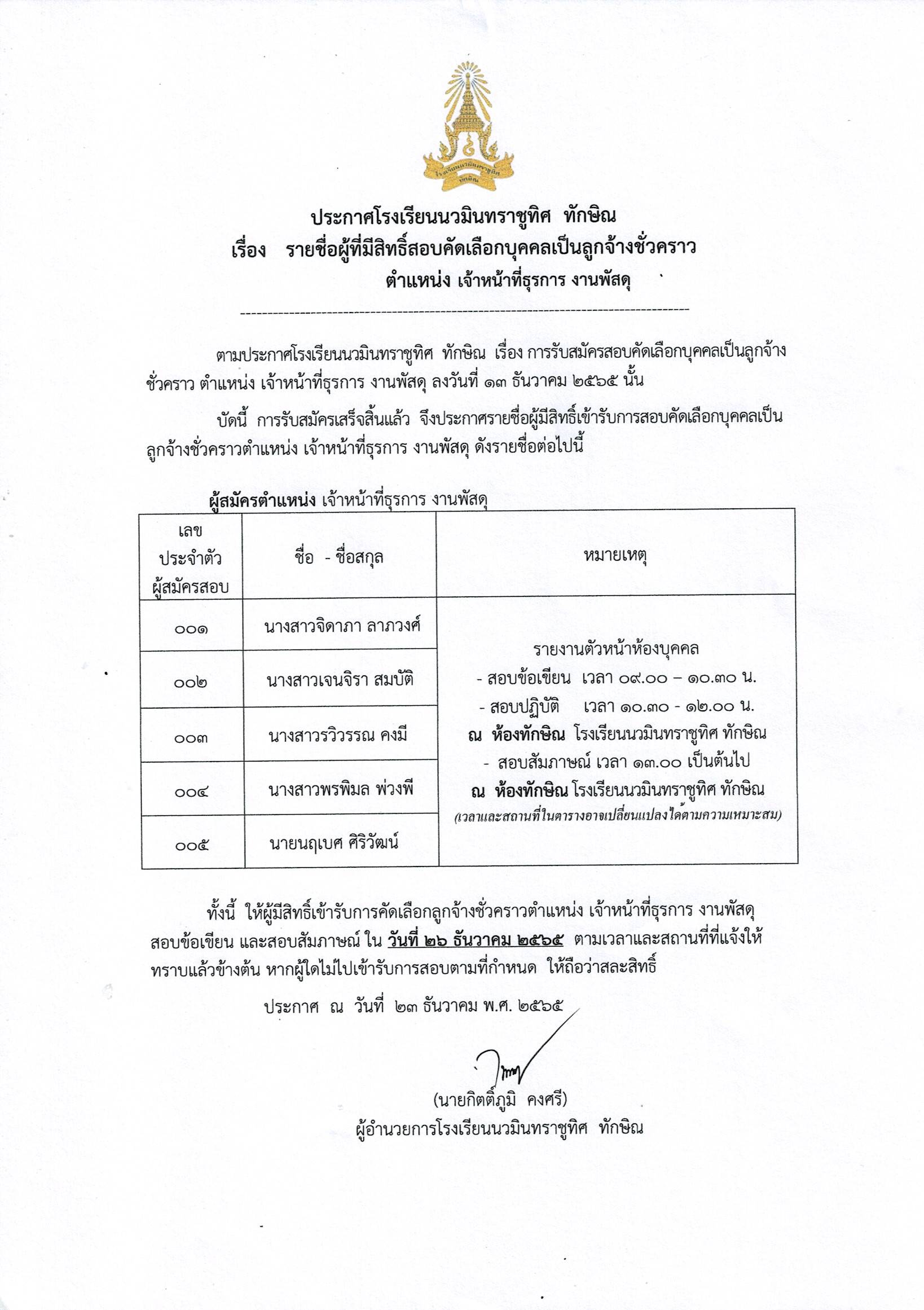 - ประกาศ รายชื่อผู้ได้รับคัดเลือกเป็นลูกจ้างชั่วคราว ตำแหน่ง เจ้าหน้าที่ธุรการ งานพัสดุ |
