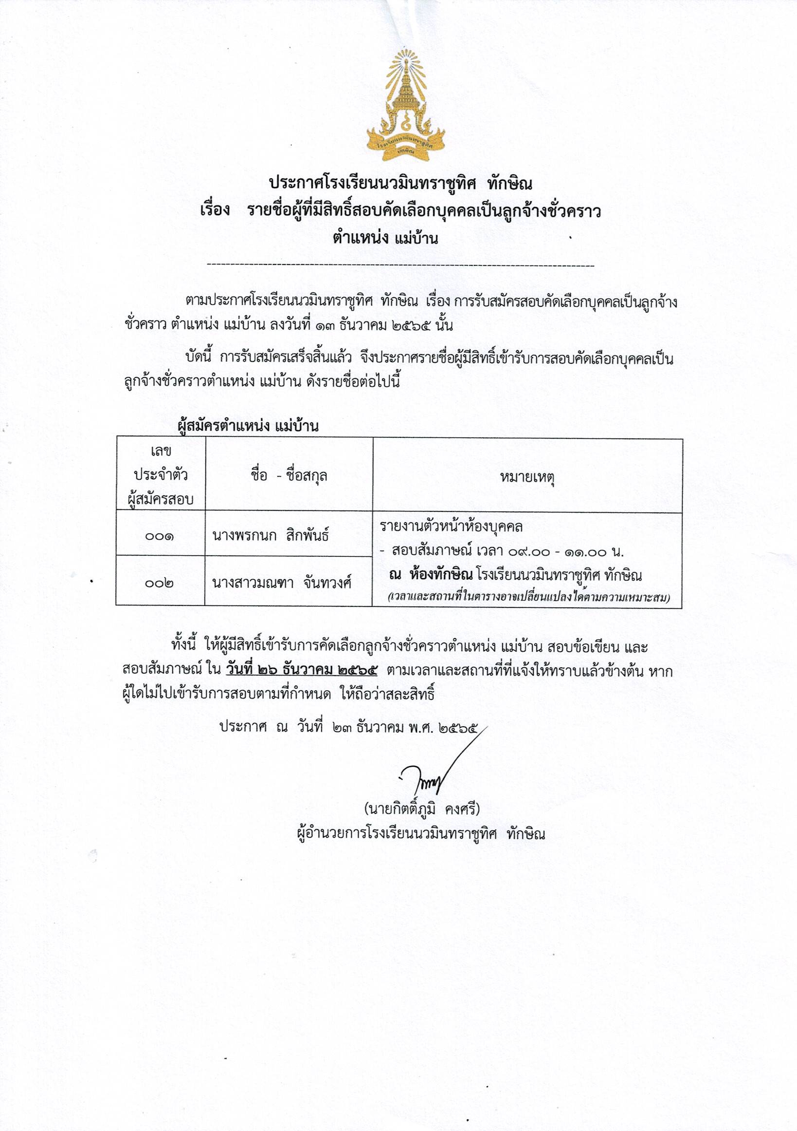- ประกาศ รายชื่อผู้มีสิทธิ์สอบคัดเลือกลูกจ้างชั่วคราว ตำแหน่ง แม่บ้าน |
