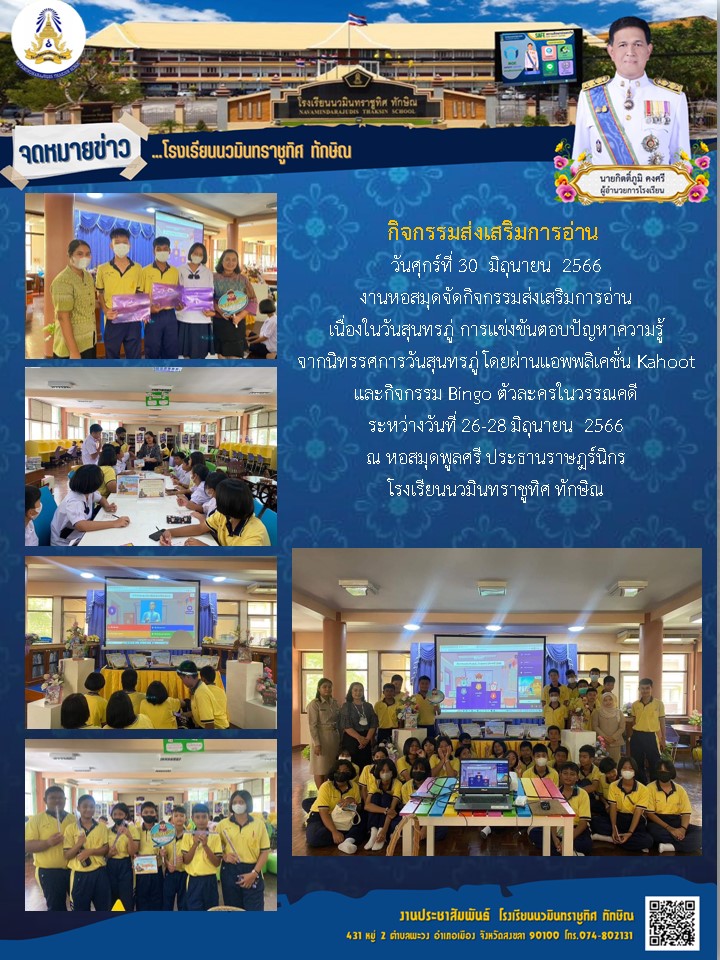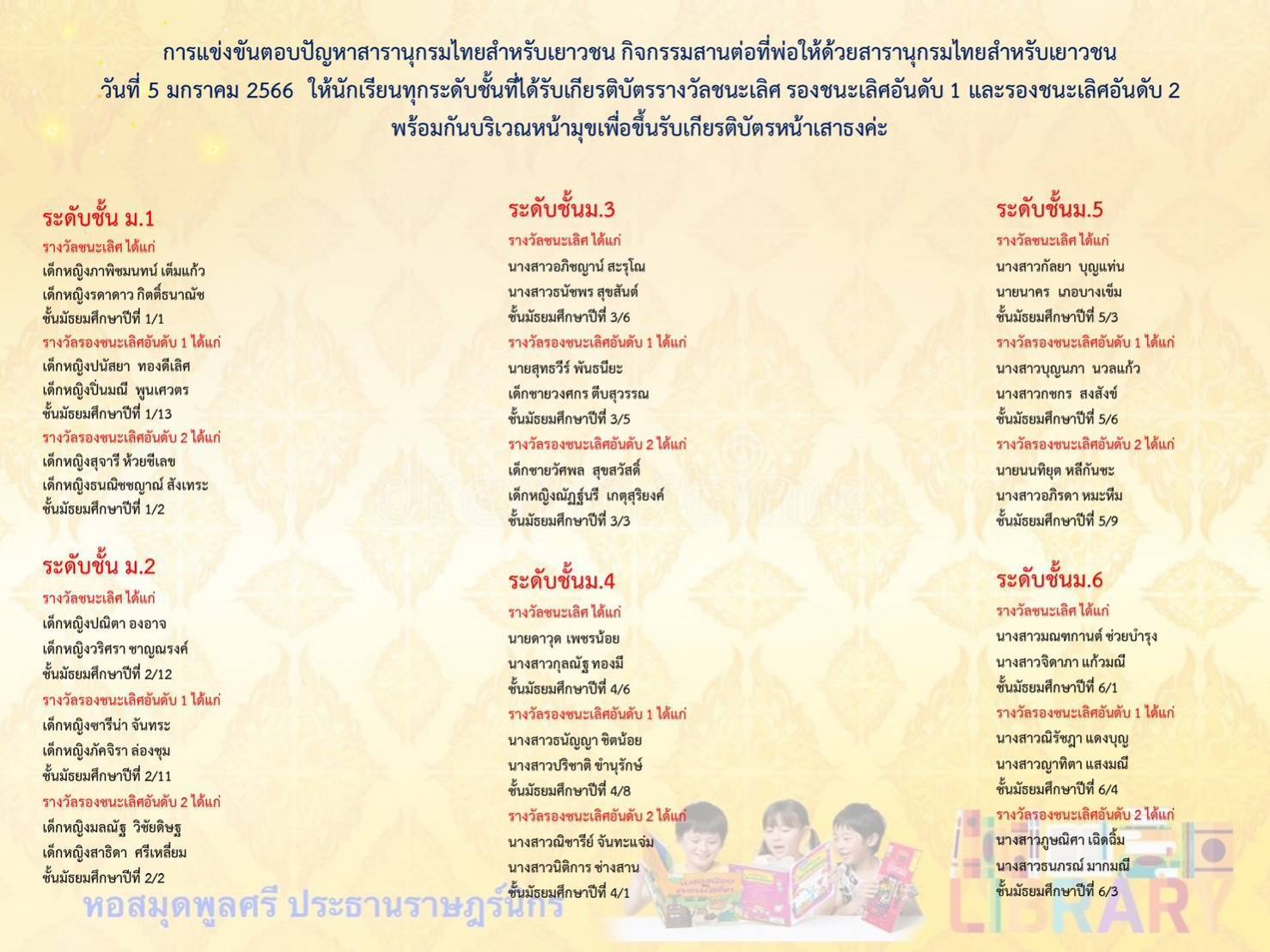 - ขอเเสดงความยินดีกับยุวบรรณารักษ์ส่งเสริมการอ่าน ม.1-ม.3 และระดับชั้น ม.4-ม.6 ได้รับรางวัลเหรียญทองระดับชาติ