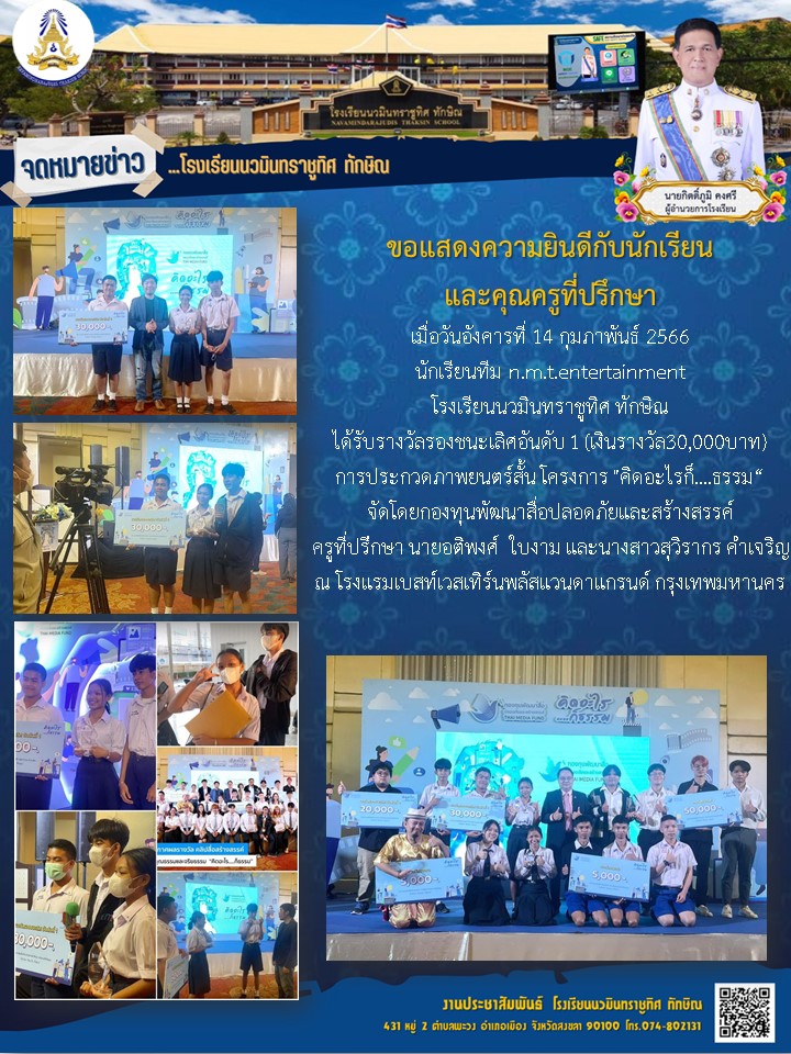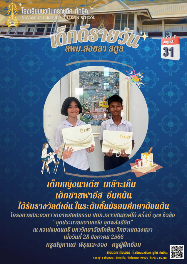 - รางวัลเหรียญทองชนะเลิศการประกวดภาพยนตร์สั้น ม.4 - ม.6 เรื่อง ความฝันของเจ้าชาย