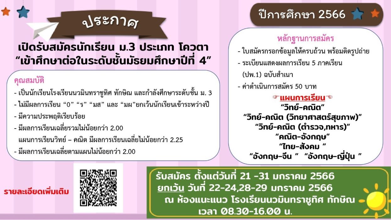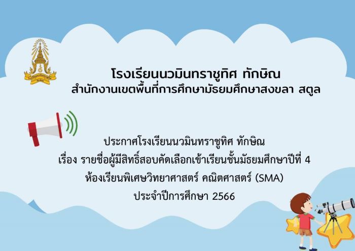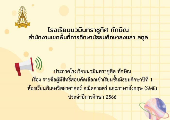 - เปิดรับสมัครนักเรียนใหม่ ชั้น ม.1 ห้องเรียนพิเศษ (SME) และชั้น ม.4 ห้องเรียนพิเศษ (SMA) ปีการศึกษา 2566