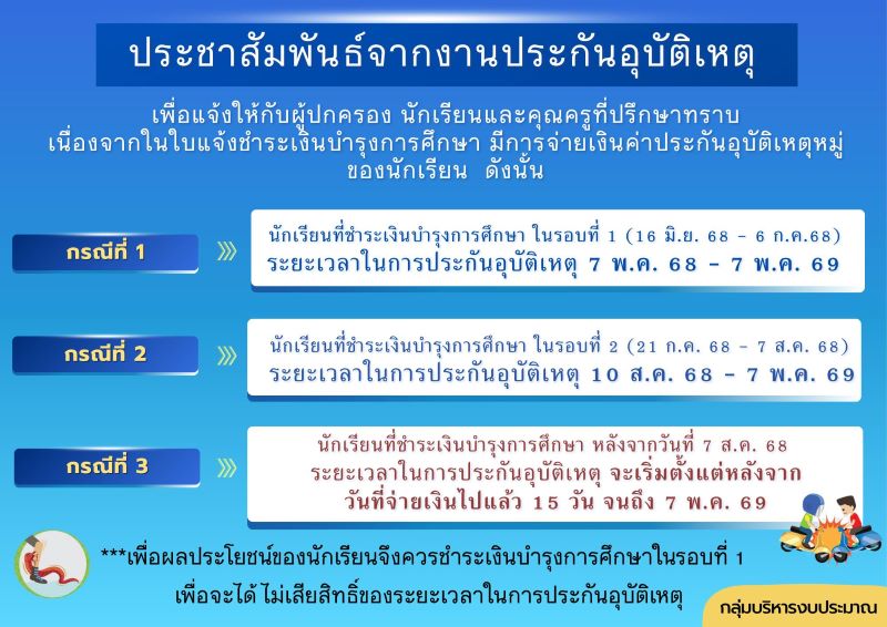- ประกาศ ผลการคัดเลือกบริษัทประกันอุบัติเหตุหมู่นักเรียน ประจำปี 2568 |